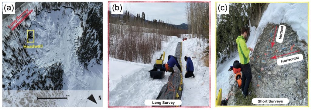 (a) The retrogressive thaw slump, headwall, (b) long and (c) short SIP survey.