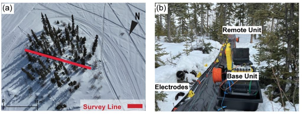 Hosein’s team developed a method to quantify relaxation time from Spectral Induced Polarization (SIP) data measured by the FUCHS III device. The method’s effectiveness was demonstrated through synthetic data and two field surveys. SIP field measurements, ranging from 1.46 Hz to 40 kHz, were conducted on a retrogressive thaw slump and a pingo in Yukon, Canada. The extracted relaxation times were mapped to pseudo-depths obtained from single-frequency inversion. This study proposes a relaxation time range from 10 to 400 μs for ground ice, and the results demonstrate that this range can detect ground ice spectra in field studies. Comparison with observations in a borehole and an exposure of permafrost indicate that relaxation time is less ambiguous in detecting ground ice in warm permafrost than conventional methods such as electrical resistivity tomography.